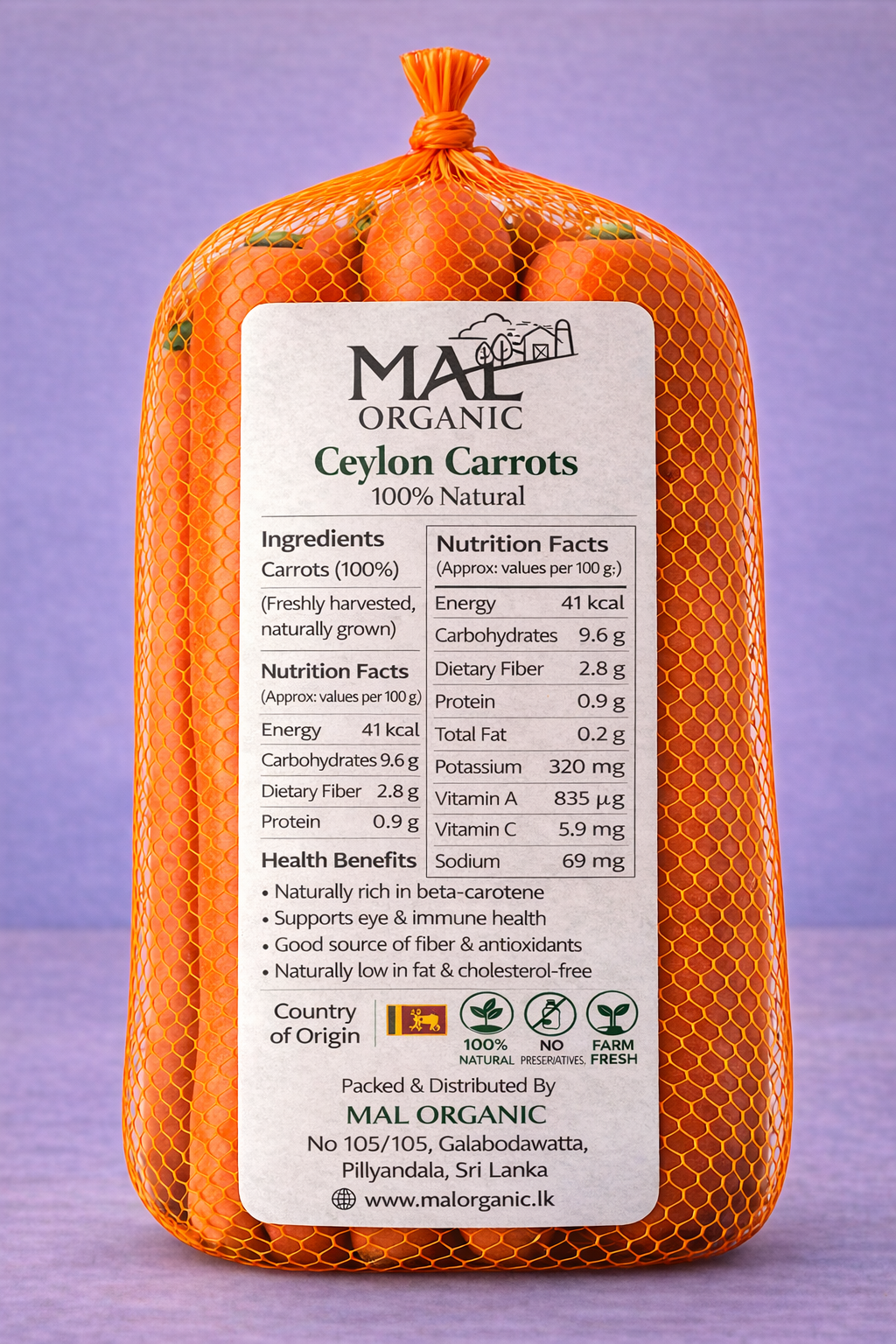 MAL Organic Carrot is freshly harvested Sri Lankan carrot grown using natural farming methods. Crisp, sweet, chemical-free, and ideal for curries, salads, juices, and everyday cooking.