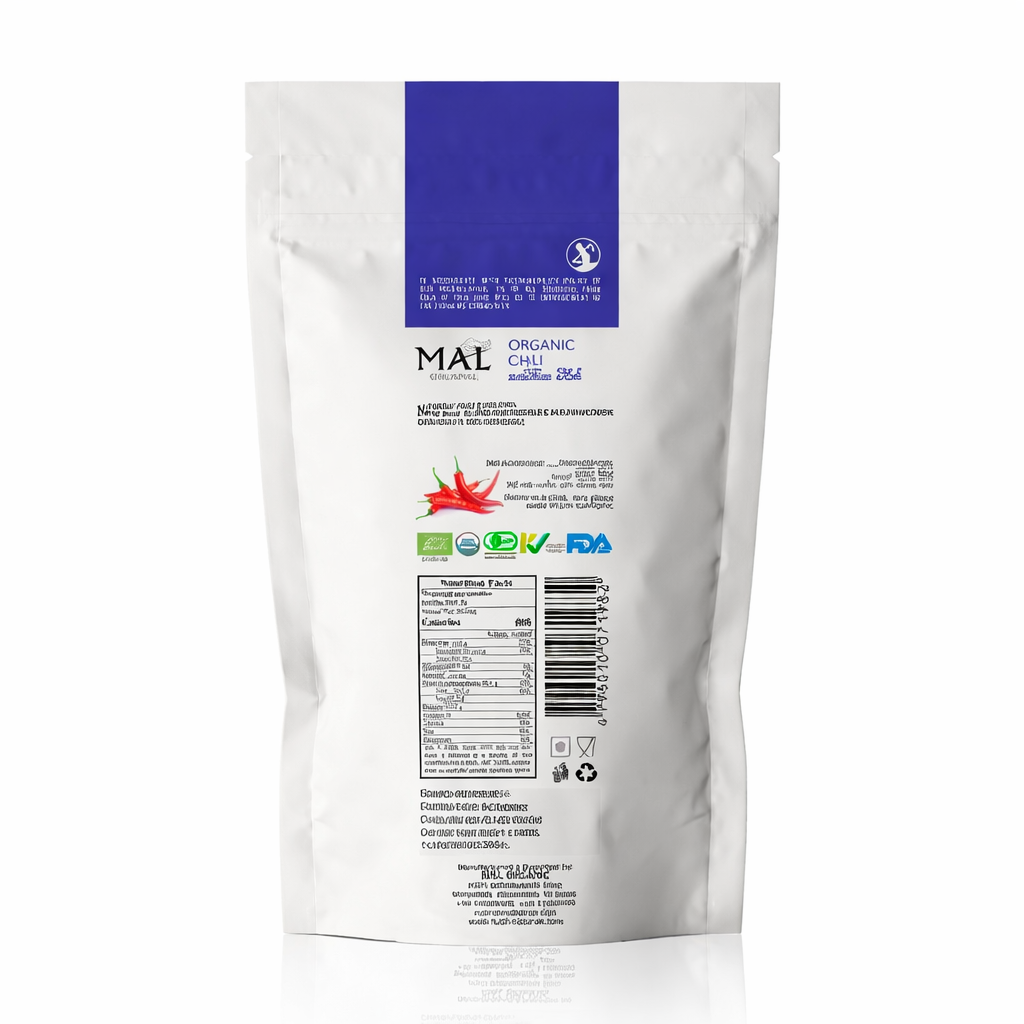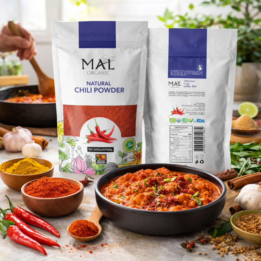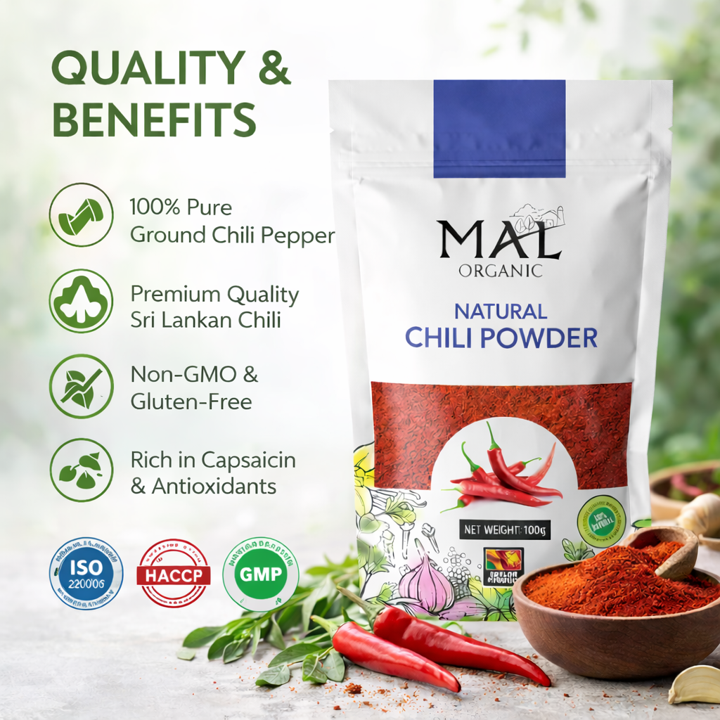 MAL Organic Chili Powder is produced from carefully selected, fully matured Sri Lankan chilies grown using natural and sustainable farming practices. The chilies are thoroughly cleaned, naturally dried, and finely ground under hygienic conditions to preserve their vibrant red color, rich aroma, and authentic heat.