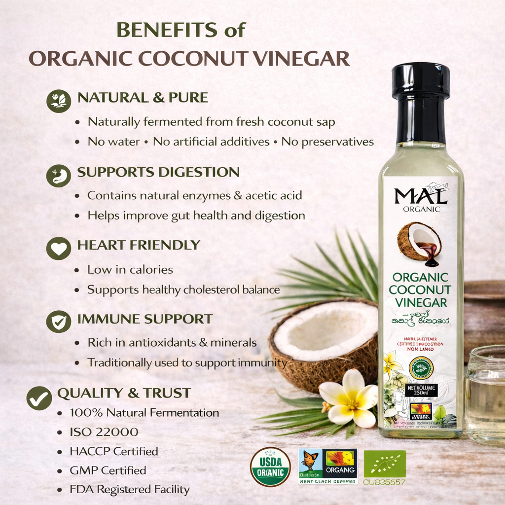 MAL Organic Coconut Vinegar is naturally fermented from fresh organic coconut water sourced from Sri Lanka. Produced using traditional fermentation methods, the coconut water is slowly aged to develop a mild acidity, clean taste, and natural aroma while preserving beneficial compounds.