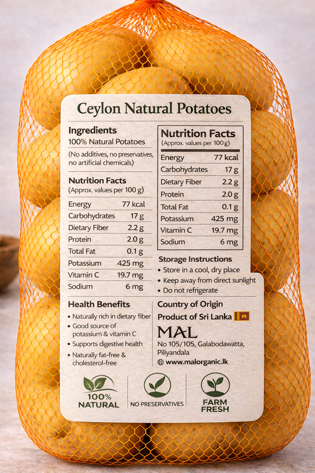 This product is made without artificial colors, preservatives, additives, or chemical treatments. MAL 100% Natural Potato delivers the true flavor of fresh potatoes, making it ideal for everyday household cooking. Its firm texture and mild, earthy taste are well suited for curries, fries, roasting, soups, stews, and traditional Sri Lankan dishes.